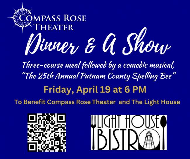 You'll enjoy a delicious gourmet meal before being mesmerized by the talented performers who will make you laugh and spell along with them! Dinner & A Show Tickets are $120/person to benefit the two local nonprofit organizations, the Light House Shelter for Homeless Prevention Support and Compass Rose Theater. Hope to see you there to support nonprofit organizations making a difference in our community!