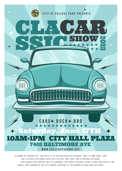 In honor of Father's Day, join the City of College Park on Sunday, June 17 from 10am - 1pm at City Hall Plaza for a Classic Car Show! There will be cars, BBQ, beer, and a rocking live band. Car plaques will be awarded. This family-friendly event is free and open to the public.